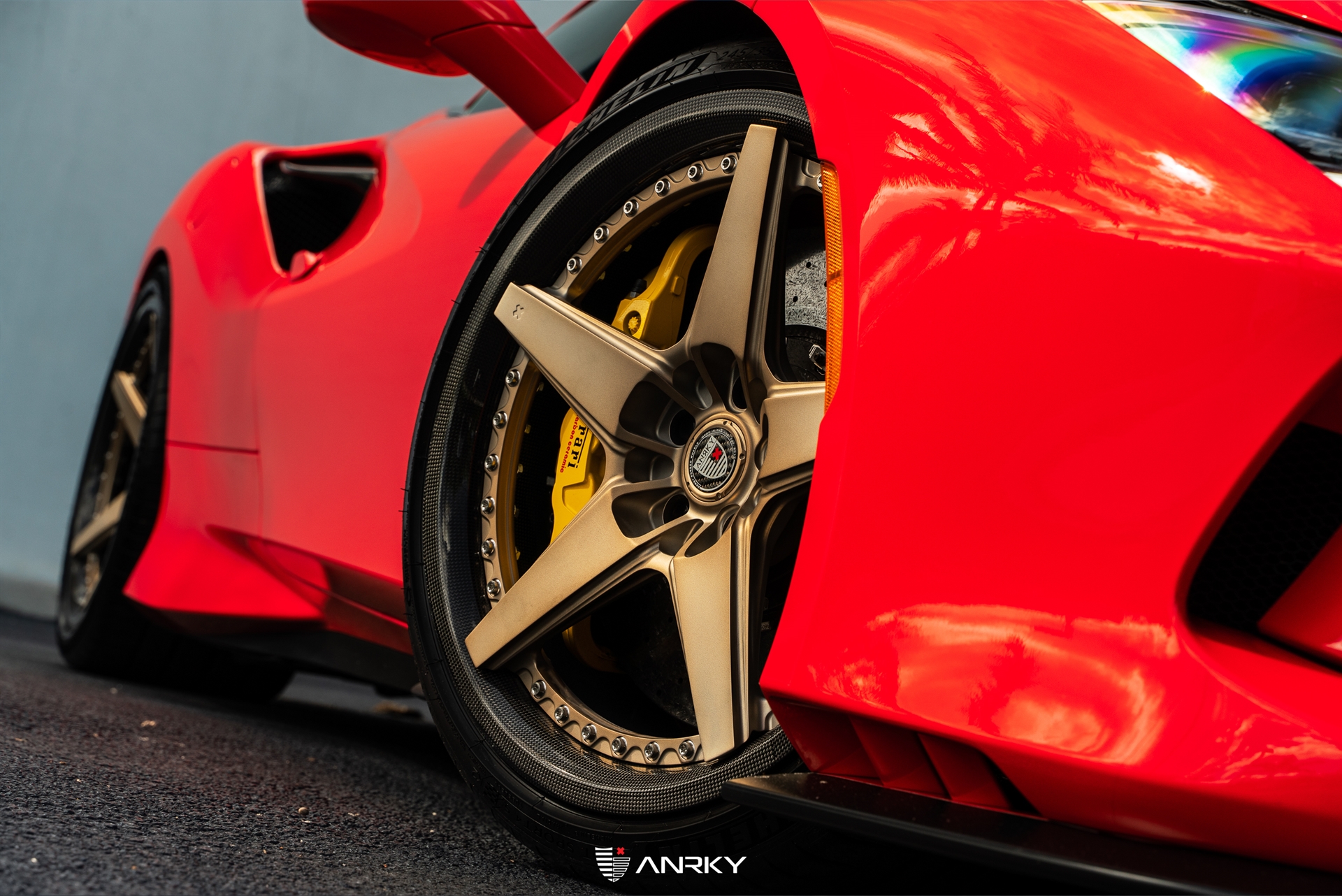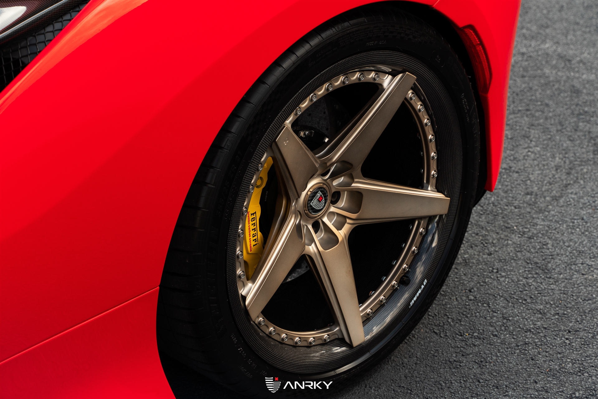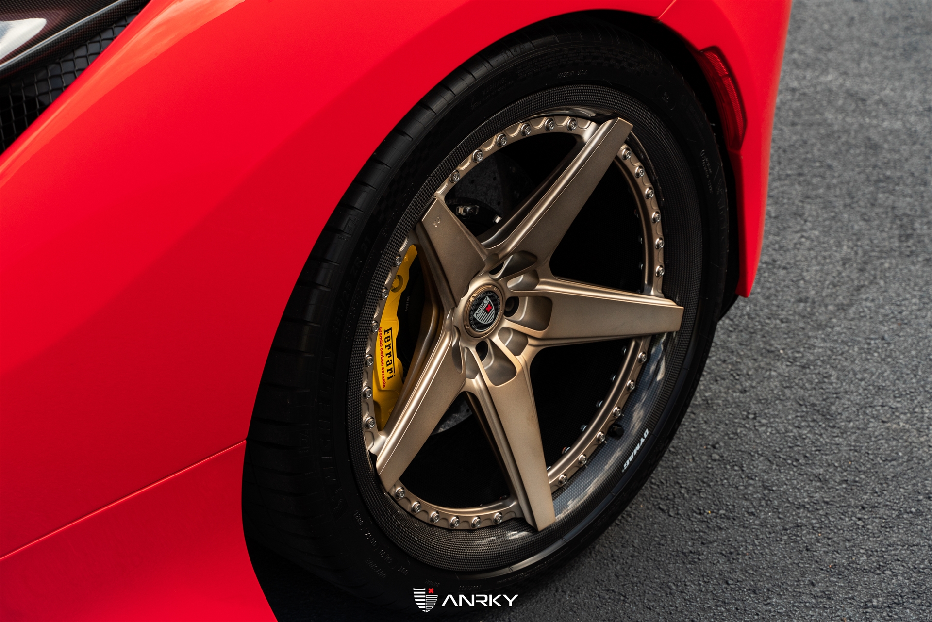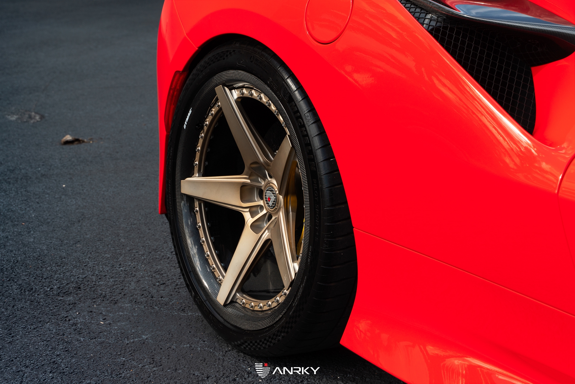 ANRKY WheelsFerrari F8 TributoRETROSeries CarbonModel: RS5.320×9.521×12.5Satin Mirror Polished Champagne CenterDymag Carbon Fiber BarrelTitanium HardwareCarbon ANRKY CapShop: Wheels Boutique